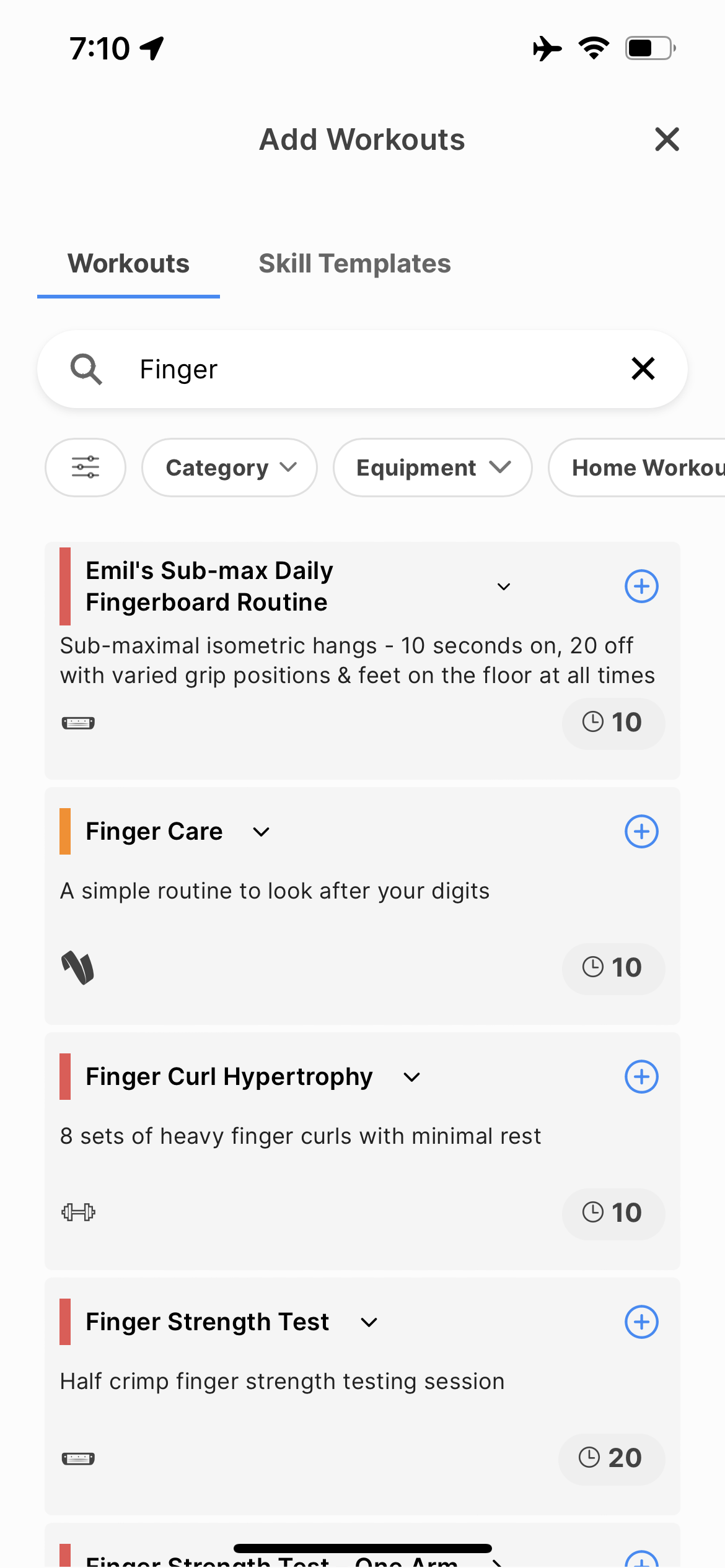 From within the Add Workouts view you can easily switch between all available Workouts and Skill Templates. The Search filters allow you to find specific workouts by Category, Equipment, or even those that are suitable for the home.