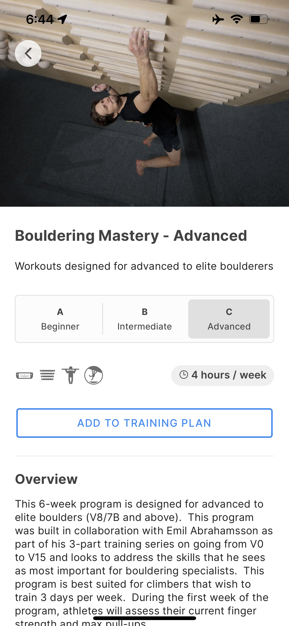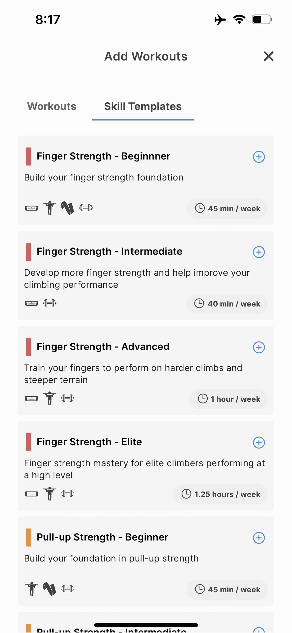 Skill Templates are designed to focus on a specific climbing skill, such as Finger Strength, Core Strength, or Pull-up Strength with progressions designed for Beginner, Intermediate, Advanced, and Elite climbers.