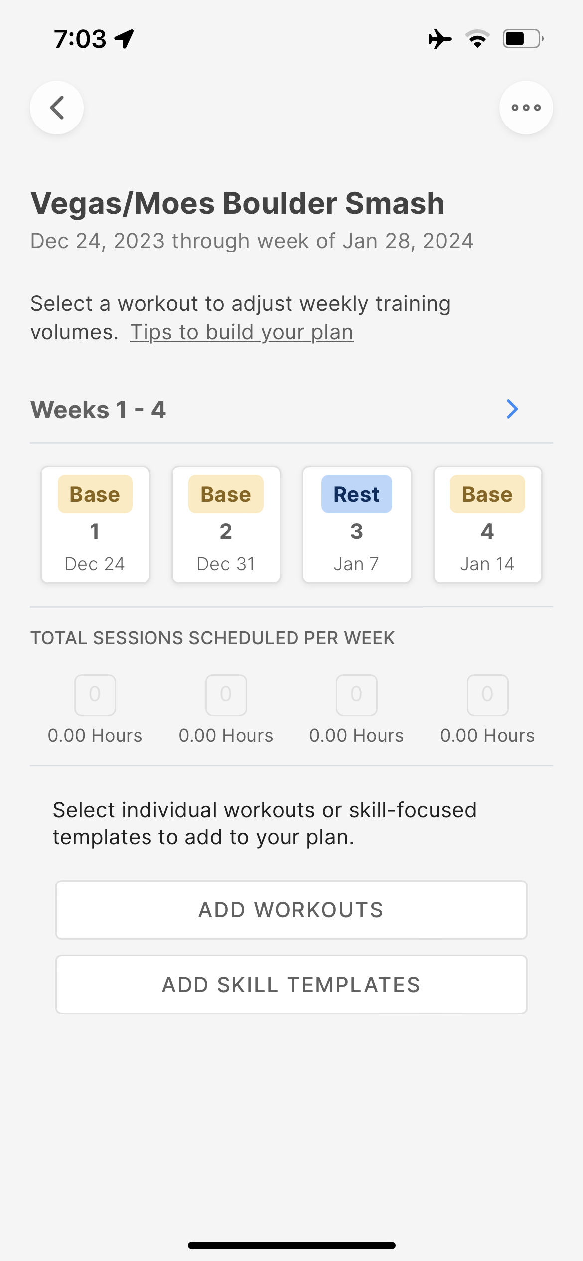 Workouts and Skill Templates can be added to your plan by clicking on either the Add Workout, Add Skill Template, or the blue + button.