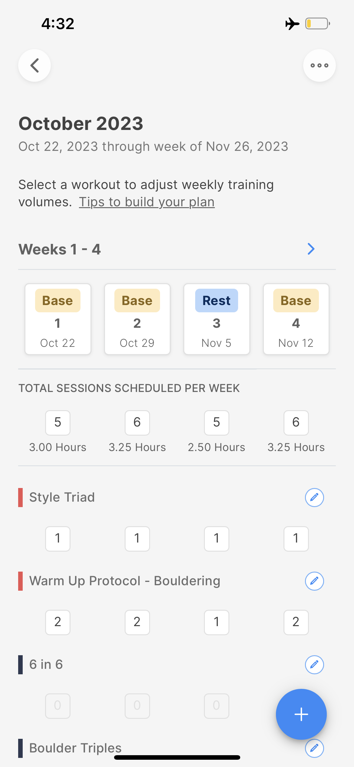 Once you have added workouts to your plan, you may begin scheduling the weekly volume for each workout by selecting the “Edit” icon next to the workout name.