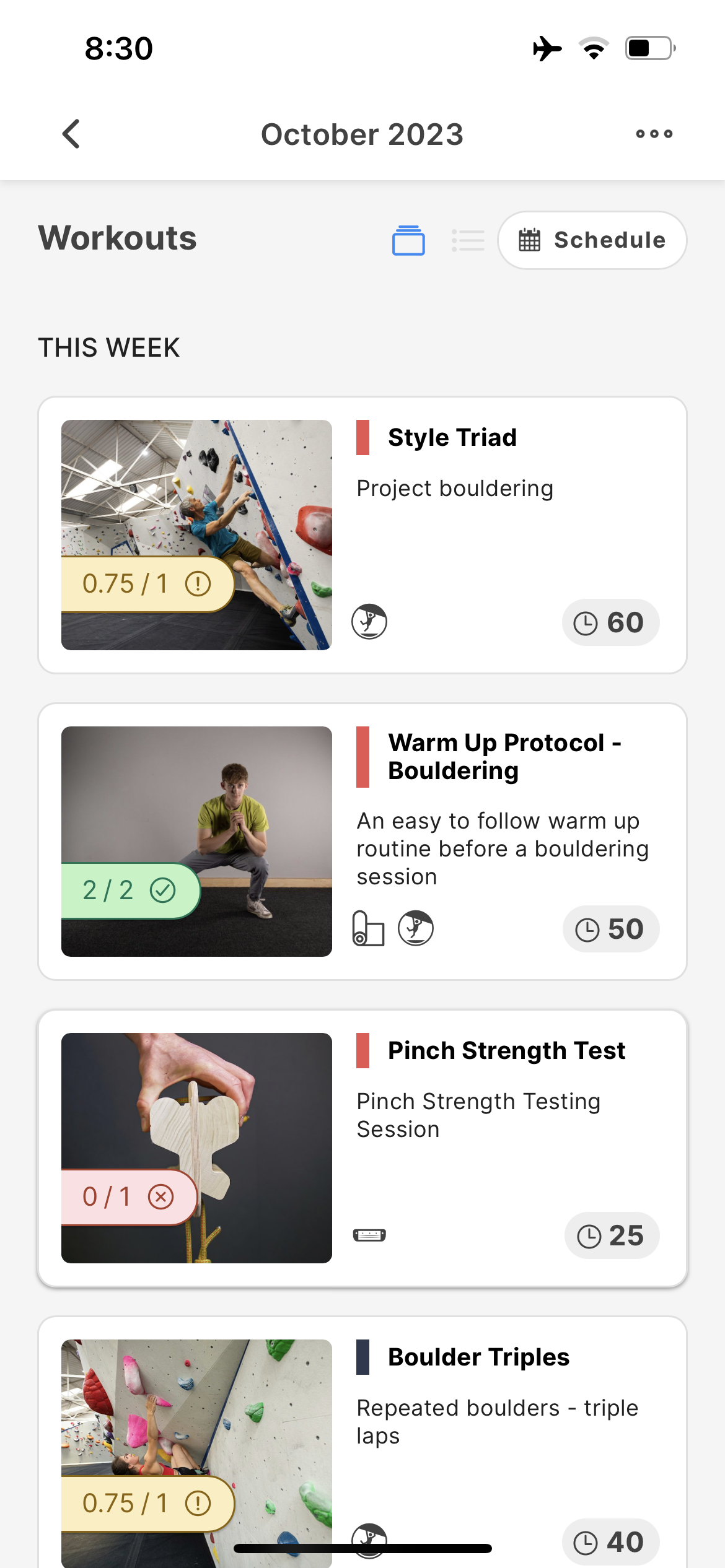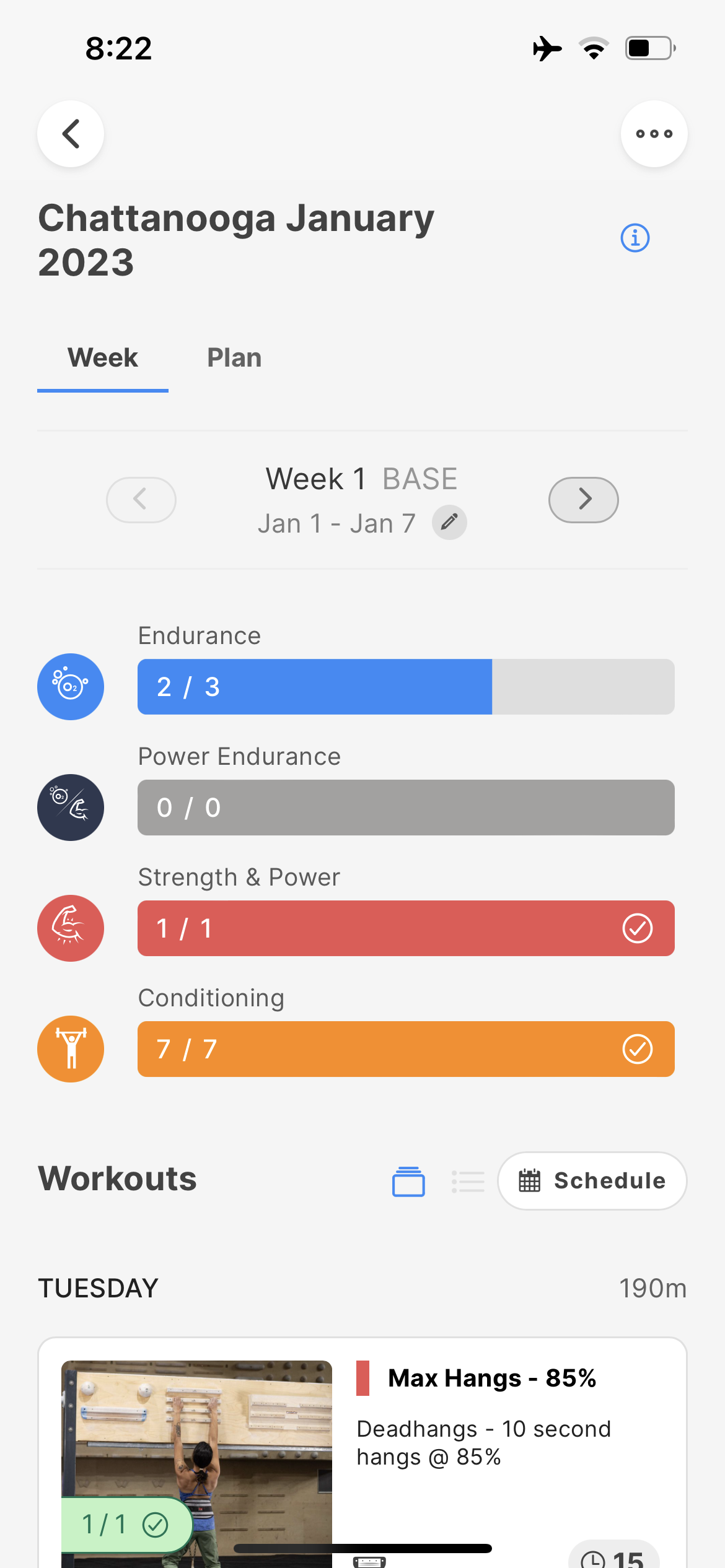 If you have spare time, great! It is totally fine to add additional climbing into your plan as long as your body is recovering well. If you have additional time, we would recommend focussing on skills based practices and climbing at your limit at the start of training session before structured training. Alternatively, if you are finding that you cannot fit everything into your schedule, it will be key to reduce the training and focus on the stimulus you need the most to improve. Try reducing several workouts by half (half the sets) to begin with. If this is still too much, eliminate a workout which is less inline with your goal, i.e. AeroCap for someone working towards a bouldering goal.