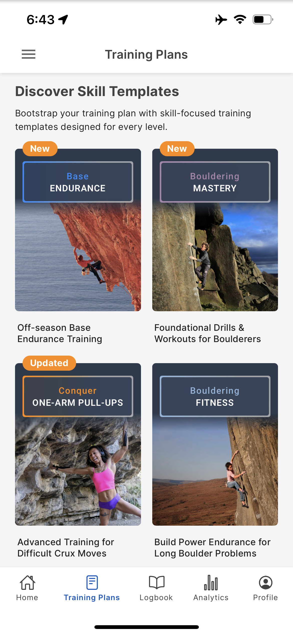Skill Templates are a feature included with Crimpd+ memberships that are designed to help climbers bootstrap their training by offering guidance on how to improve a specific skill relevant to climbing performance. Skill templates can be found on the Training Plan tab of the Crimpd app